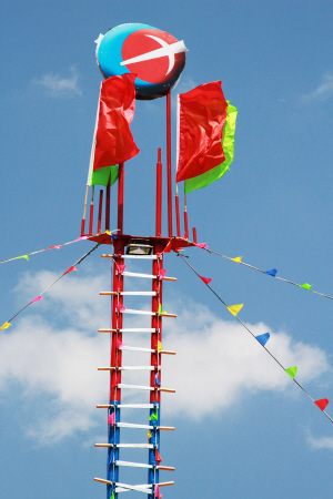 2011年,緬甸傈僳學(xué)會在密支那舉辦了第一屆世界傈僳闊時節(jié),第一次將十幾米高的弩弓木雕作為會徽。該木雕高高聳立于密支那郊區(qū)闊時節(jié)會場,還有印有傈僳族徽的紅旗插滿會場四周,高高飄揚,與巨型木雕相互輝映,構(gòu)成了一個以弩弓木雕為核心,族徽紅旗環(huán)繞的闊時節(jié)會場空間。其內(nèi)其外,傈僳族空間與非傈僳族空間區(qū)隔明顯。