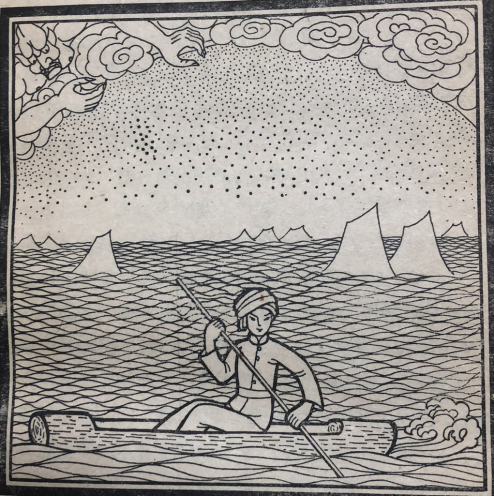厄霞看見札努札別依然沒有餓死,又想出了一條毒計:他把天河上的水放下來,整個大地變成白茫茫一片汪洋大海。跑到高山去的人僥幸沒有淹死。住在平地上的人,都被洪水淹死了,厄霞以為這一次札努札別也一定淹死了。但當(dāng)厄霞來看時,札努札別坐在掏空了的木槽里漂在水面上,依然沒有淹死。于是,原來不知道造船的人們,從這次起,后世便知道造船了。