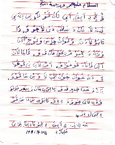 “小經(jīng)”作為一種拼寫(xiě)文字形成之后,在經(jīng)堂中曾出現(xiàn)過(guò)“阿文小經(jīng)文字對(duì)照表”,不僅經(jīng)堂學(xué)員用“小經(jīng)”來(lái)注釋經(jīng)文或作筆記,一些阿訇也以之翻譯某些經(jīng)文或進(jìn)行著述。在部分回族穆斯林中,它也曾被用作寫(xiě)書(shū)信、記日記或記事的應(yīng)用文字。因有些漢語(yǔ)語(yǔ)詞極難拼準(zhǔn),故行文中常夾雜一些阿拉伯文或波斯文的原詞,也有夾雜個(gè)別漢字。