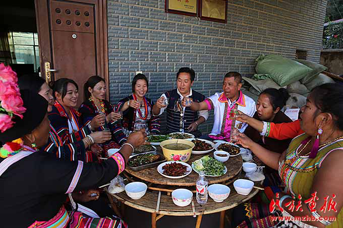 曼夕村60多歲的玉兒班老人說:“過去缺吃缺穿,盼望過節(jié)時(shí)能吃好吃的穿新衣服,現(xiàn)在日子紅紅火火,遇到好時(shí)光,希望能多活幾年?!辈祭首鍙棾〖墏鞒腥擞窨怖?dāng)天與她的幾個(gè)學(xué)生在一起過節(jié)吃飯,性情直爽的她高興地唱了起來:“我們團(tuán)結(jié)一致,同住一個(gè)地球,同走一條路,共享一個(gè)太陽,我們手拉手,心連心,建設(shè)美好家園。黨的政策好,沒有共產(chǎn)黨就沒有我們幸福生活,共產(chǎn)黨政策像溫暖的太陽照耀我們,要過幸福生活就跟著共產(chǎn)黨走?!?/p>