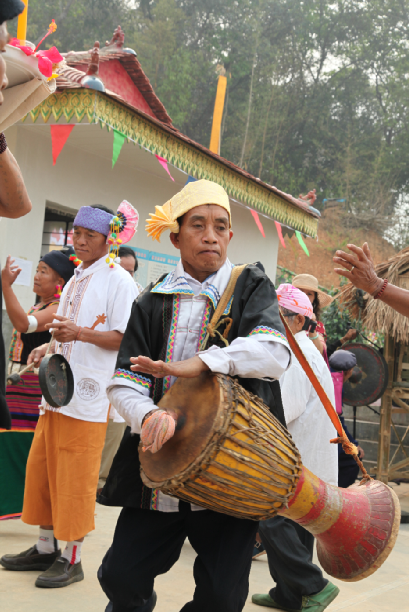 打歌:保山地區(qū)施甸縣布朗人(濮滿)在祭龍活動(dòng)或結(jié)婚佳期都要舉行“打歌”?!按蚋琛币彩沁叧柽吿璧囊馑肌!按蚋琛敝跋纫x出一個(gè)能歌善舞、嫻于交際的“打歌頭”,由他主持歌舞晚會(huì)。屆時(shí)庭院中安置幾張方桌,桌上陳設(shè)豬頭、松子、葵瓜子、酒等類東西?!按蚋桀^”將豬頭抬起,邊唱邊繞桌三轉(zhuǎn),然后把豬頭放在桌上,燃香三柱插于豬鼻內(nèi),眾男女即在樂(lè)器聲中翩翩起舞,邊唱邊跳“大翻身”“小翻身”等舞蹈。伴泰樂(lè)器有蘆笙、小三弦、竹笛等。眾人在“打歌頭”的帶領(lǐng)下直跳到東方發(fā)白,興盡方散。