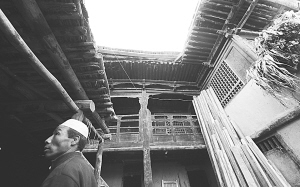 當地一名撒拉族村民經過一處有著百年歷史的籬笆樓