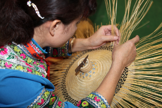 三角鉤鋤是毛南族特有的生產(chǎn)工具,毛南語叫“拱”。它小巧輕便,適合在雞窩地里中耕鋤草,又用于點(diǎn)種黃豆。種黃豆還有一種木制的“點(diǎn)穴錘”,用8寸到1尺長(zhǎng)的金剛木削成圓桿,形如搟面杖,中間插一木柄,手握木柄在泥土里一錘,就成一個(gè)如雞蛋形的坑,即可放入黃豆,蓋上草木灰。這種“點(diǎn)穴錘”一錘一穴,工效很高,是種黃豆的最佳農(nóng)具。此外還有禾剪、割煙刀等(圖為毛南族織錦)。