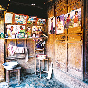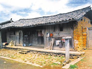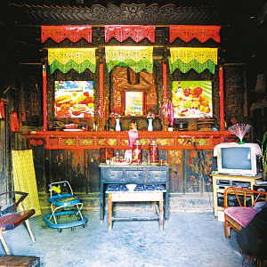 隴川縣戶撒鄉(xiāng)曼旦寨是阿昌族古老的村寨之一,明、清時期的老宅皆以楠木建造,數(shù)百年不朽、無蟲蛀。受漢族文化影響,傳統(tǒng)民居大都是土木石結(jié)構(gòu)的三合一照壁或四合院落。正房建在長方石條加土方壘起的屋基上,屋基下為院壩,以三層石階上下。正房三開間,四排五柱,中柱起脊,形成雙斜面屋頂,上覆凹型青瓦。后墻和兩側(cè)山墻以土坯砌筑,外面不抹泥,左右是廂房或照壁。室內(nèi)隔墻均為木板,中間一間為堂屋,有一米多寬的吞口,六扇雕刻的木板門,平時只開中間兩扇。兩邊的檐柱頭有粗獷的木雕。吞口有走廊的作用,一般左側(cè)角設臉盆架以供洗漱,板壁上掛小鏡框以便梳妝,旁邊掛著家人的照片。有的擺著縫紉機,有的放藤椅小憩。右側(cè)放臨時的農(nóng)具,掛衣服,板壁上貼著影視明星的招貼畫。堂屋正面板壁是通高的木雕佛龕,供奉佛像和傣文的經(jīng)文,龕楣上貼著三至四層掛錢,下面有燭臺、香爐。左側(cè)擺著電視機、熱水瓶、茶桌,板壁上掛著戶撒刀和手工編織的背兜,右側(cè)有專供老人休息的床或藤椅,也有的砌火塘,火塘的小土臺上放著炒菜的調(diào)料、火柴和照明燈具。