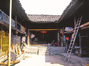 廚房大都在左間,地中間橫砌土臺鍋灶,上面是兩口大鐵鍋??亢髩κ谴毒摺⒉途?,前面是石碓,平時搗豬飼料,節(jié)日搗粑粑,用石碓搗的辣椒面也格外好吃。右間大都是家長的居室,只放木床。兩側(cè)廂房與主房分離,木板梯上下。一側(cè)下層是豬圈、牛欄,上邊存干草;另一側(cè)下面堆放糧食、燒柴、摩托車,上層是未婚子女的臥室,有廊道、腰欄。院落小的,在主房對面設牛欄,砌土坯墻圍成獨立的合院。