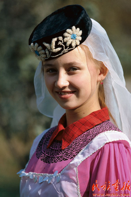 塔塔爾族的婚俗別具一格。按塔塔爾人的傳統(tǒng)習(xí)慣,婚禮在新娘家舉行,即先把新郎“嫁”出去,然后再“娶”回來。婚姻過程主要經(jīng)歷提親、相親、訂婚、納聘、嫁新郎、娶新娘六個(gè)過程(塔塔爾族少女。引自民族畫報(bào))。