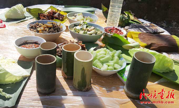 基諾族地區(qū)食材豐富,一日三餐,以大米為日常主食,雜以玉米、瓜豆等。每年5—9月的雨季,基諾山漫山遍野是食材,山藥、水芹菜、竹筍、魚(yú)腥草及各種菌類等無(wú)污染且很新鮮,是難得的烹飪材料,經(jīng)過(guò)簡(jiǎn)單處理就成為餐桌上的美味佳肴。基諾族民間有句俗話,叫“漢炒、傣蘸、基諾舂”,也就是說(shuō)漢族人喜歡吃炒菜,傣族的菜喜歡蘸著調(diào)料吃,基諾族的菜則以臼舂為主?;Z族的肉類的吃法較多,可以腌成干巴,也可吃新鮮的。酸腌魚(yú)、涼拌茶也是基諾族的最愛(ài),基諾人做飯就餐均在竹樓二層的火塘周圍進(jìn)行,有一定的禮節(jié)和講究?;Z族吃飯時(shí),主人首先要在火塘東側(cè)獻(xiàn)一點(diǎn)飯菜祭祀祖先和灶神,吃飯時(shí)全家人按順序在火塘旁圍蔑桌而坐,家長(zhǎng)正對(duì)火塘,客人靠火塘而坐。