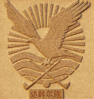 獵鷹是達斡爾族人民的吉祥物,這與達斡爾族先民曾以狩獵作為主要生產(chǎn)活動方式有關。在以弓箭為主要工具的狩獵年代,獵鷹是達斡爾族人狩獵的得力助手。獵人騎著駿馬,用手臂托舉著獵鷹,尋游于荒野山林之中。如果發(fā)現(xiàn)野雞、野兔等飛禽和小型動物,便令獵鷹迅速出擊。獵鷹從高空俯沖而下,能非常準確有效地捕獲獵物。達斡爾人自古以來善于馴養(yǎng)獵鷹,擁有一只聰明伶俐、敏捷強悍的獵鷹成為獵人的驕傲。達斡爾人崇拜獵鷹,視獵鷹為忠貞、崇高、堅強的象征,因此教育后代要象雄鷹一樣目光明敏銳,勇敢頑強,不怕流血犧牲,戰(zhàn)勝前進道路上的一切困難。