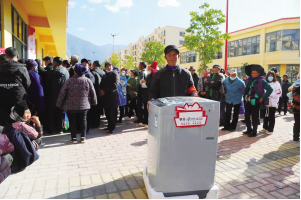 在社區(qū)的樹新風(fēng)積分超市前,居民們排起整整齊齊的長(zhǎng)隊(duì),不由得讓人好奇。