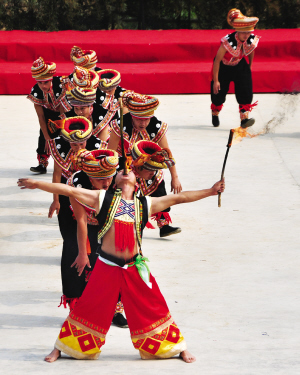三江縣高基瑤族鄉(xiāng)的瑤族同胞表演傳統(tǒng)民俗吞火把