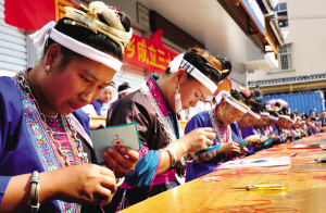 三江縣同樂苗族鄉(xiāng)舉辦刺繡手工限時賽,繡娘們向游客們展示傳統(tǒng)的少數(shù)民族刺繡技藝
