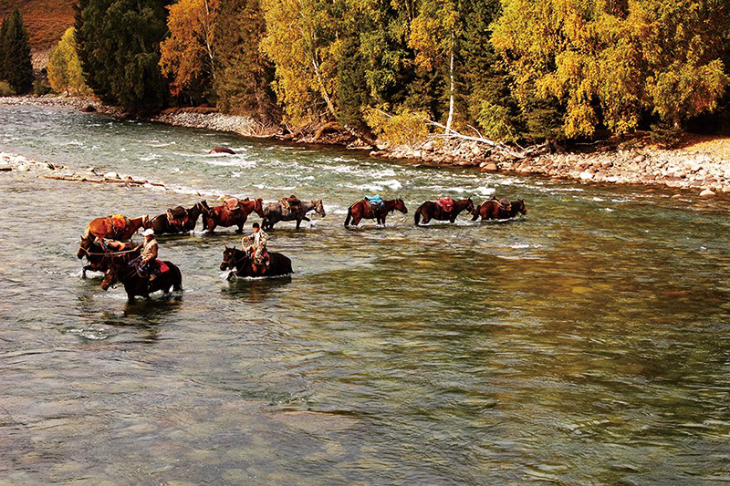 這時(shí)候,一位哈薩克族牧民騎著馬一邊往這邊走,一邊唱著歌。空曠的夜晚因?yàn)橥蝗挥辛怂母杪?,一下子便被打破了寧?kù)o和孤獨(dú)。他走到我跟前,從馬上跳下來(lái),愣愣地望著月光中的阿克哈巴河。我覺(jué)得他有點(diǎn)奇怪,怎么突然瞅著阿克哈巴河就發(fā)起了呆。過(guò)了一會(huì)兒,他表情復(fù)雜地看了我一下,然后轉(zhuǎn)過(guò)身去,準(zhǔn)備牽馬離去。