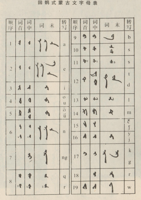 回鶻式蒙古文是一種拼音文字,字母分表示元音和表示輔音的兩大類。書寫時元音字母和輔音字母結合得很緊,筆畫連在一起,一氣呵成。最小的書寫單位是詞。但早期拼寫法不甚嚴密,有一個詞分做兩段書寫的情況。書寫格式是從上往下豎寫,從左往右移行?;佞X式蒙古文字母在詞首、詞中、詞末等不同位置上筆畫略有變化,以適應連寫的需要。
