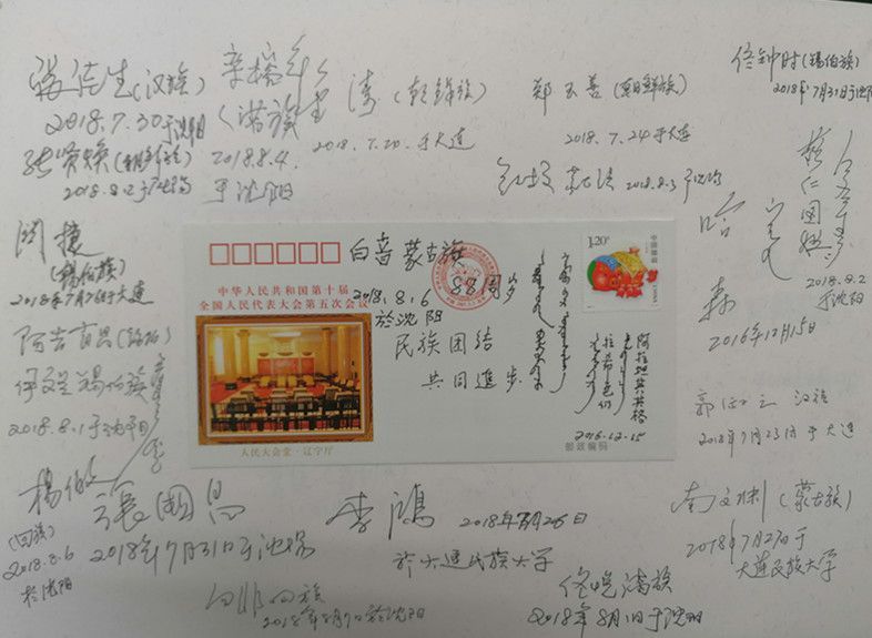 在采集口述影像錄音資料的同時(shí),項(xiàng)目組還收集了大量的珍貴歷史照片以及相關(guān)文物。值得一提的是,他們?cè)O(shè)計(jì)了一種非常有特色的受訪者簽名簿,中間貼著繪有56個(gè)民族的音樂(lè)舞蹈圖案的首日封或明信片,四周簽上受訪者的人名簽名字、民族特征,有些還用民族文字書寫,體現(xiàn)了中華各民族團(tuán)結(jié)在一起的精神風(fēng)貌。簽名簿有厚厚的幾大本,設(shè)計(jì)精美,承載著民族工作口述史資源采集的經(jīng)歷,具有豐富的文化內(nèi)涵和博物館收藏價(jià)值。