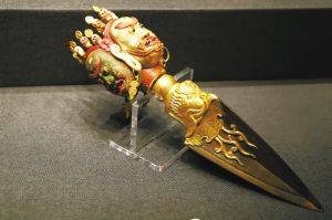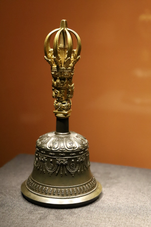 持驗(yàn)法器單元主要展示修持佛法、舉行佛事活動(dòng)和佛教儀式時(shí)所用的法器,包括金剛鈴、金剛杵、嘎巴拉碗、嘎巴拉鼓、嘎巴拉念珠、喀章嘎、金剛橛、鉞刀等。本部分所選法器多為藏傳佛教密宗修行所用,因多存于庫房,已不在原佛堂陳設(shè),其用途和使用場(chǎng)所便難以知悉。故宮中有許多佛堂,大多是乾隆時(shí)期建造,其中很多是密宗佛堂,如雨花閣、梵華樓、梵宗樓、養(yǎng)心殿西暖閣佛堂等。