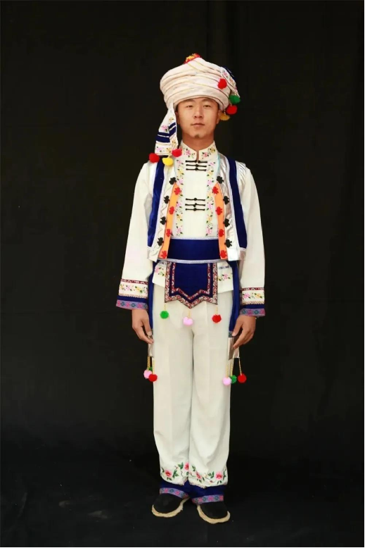 白族有著尚白的傳統(tǒng),白族男子喜纏白色或藍色包頭,多穿白色對襟上衣,外套黑領褂,下身穿寬筒褲,系拖須褲帶,腳穿剪刀口布鞋,有的還佩帶繡有美麗圖案的掛包,顯得敦厚英俊,灑脫大方。