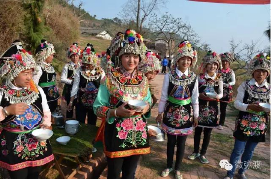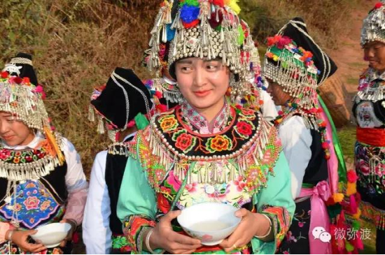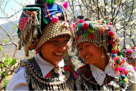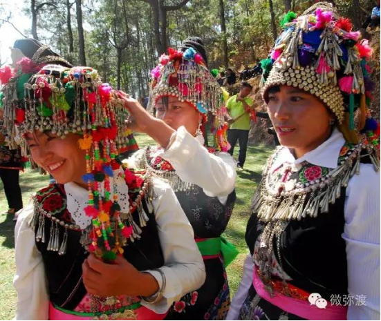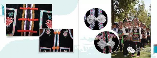 “羅羅潑支”男女服飾的特點(diǎn):“羅羅潑”男子服飾與“迷撒潑”相差無幾,一般不戴白頭巾。但是婦女的服飾相差卻很大,明顯保留著古樸高雅的南詔遺風(fēng)。頭飾由桂花、包頭、飄帶、大墜子、蜜蜂墜、芝麻鈴組成。桂花墊子在裱布上蒙黑色面料,中間訂有銀飾。包頭以黑色為主,長約2米,后鏈系于包頭,鏈子為銀制。飄帶長約4尺,黑色留花邊,兩頭訂英蘇。包頭還系有大墜子、蜜蜂墜各一對,芝麻鈴20個(gè)。領(lǐng)合由裱布黑色面料上訂芝麻玲20個(gè)圍在脖子上。圍腰的前胸部,由領(lǐng)口至腹部,左右各垂掛一條綴有串珠、針筒、響篾(口弦)一類飾品和生活用品的銀質(zhì)項(xiàng)鏈。人一走動(dòng),全身的小蘇鈴就響,聲音悅耳動(dòng)聽,形象美觀大方。額頭前還圍有一塊翠綠色的“桂花綁”,綁上釘有銀質(zhì)小泡泡200多顆,羅羅潑支婦女的服飾彰顯華麗之美。