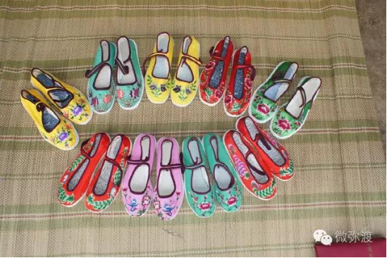 繡花鞋分大口鞋、小口鞋兩種。大口鞋大方素雅,小口鞋古樸艷麗。花樣有“峰趕梅”、“喜鵲登枝”、“獅子滾雪球“、“鳳穿牡丹”和彝族人民結(jié)婚時(shí)候,按當(dāng)?shù)仫L(fēng)俗所需必須穿的“毛邊底”等。這些花樣圖案具有不為時(shí)代變幻所動(dòng)的恒久性質(zhì),蘊(yùn)藏著濃厚的傳統(tǒng)民俗文化。它給予人們的絕不僅僅是絢麗悅目的美感,還是彝民們征服自然,繁衍生息,爭取愛情和歡樂的記錄。