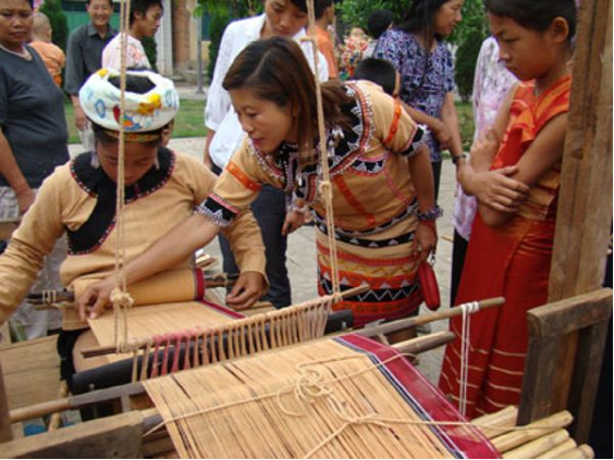 2010年上海世博會(huì)活動(dòng)周期間,一臺(tái)名為《記憶云南》的18項(xiàng)非物質(zhì)文化遺產(chǎn)展示成為最吸引眼球的亮點(diǎn)之一?;顒?dòng)現(xiàn)場(chǎng),18名云南非物質(zhì)文化遺產(chǎn)傳承人和民間藝人展示白族布扎、納西族東巴畫、傣族剪紙、傣族竹編、佤族織錦技藝等制作技藝。其間展示的佤族織錦技藝在民族文化風(fēng)情濃郁,文化底蘊(yùn)深厚的耿馬縣佤族村寨里流傳甚廣。在耿馬的佤族村寨里,婦女們一般都會(huì)紡線織布,佤族傳統(tǒng)服飾也多用自染自織的土布縫制。此地佤族傳統(tǒng)服飾按地域分為兩大類。一類是分布在耿馬鎮(zhèn)、四排山鄉(xiāng)的傳統(tǒng)服飾,以女性身著佤族紅色短衣筒裙、男子身著佤族黑衣寬褲為標(biāo)志;一類是分布在勐簡(jiǎn)鄉(xiāng)大寨村的“黃衣阿佤”服飾,以女性身著佤族黃衣筒裙、男子身著黃衣寬褲為標(biāo)志。佤族婦女所用的紡線有棉線、麻線兩種。棉主要是草棉,麻主要為苧麻和野生火麻,紡線采用內(nèi)地傳入的有紡錘的紡車。在耿馬鎮(zhèn)芒國(guó)村芒俄村民小組等佤族聚居村寨,筆者先后目睹了佤族織錦的全過(guò)程。只見紡織 中的佤族婦女一個(gè)個(gè)端坐在紡車前,凝神專注地操持著手中的活計(jì)。她們左手持麻,右手持紡錘,將紡錘放在大腿上一搓,紡錘轉(zhuǎn)動(dòng)起來(lái)后,把麻纖維慢慢從左手拉出并捻成線,紡好一截線便將它繞到小竹棍上。如此這般不停地左右穿梭,又不斷地再搓、再捻,紡出的布匹紋理細(xì)密、結(jié)實(shí)挺拔。耿馬四排山鄉(xiāng)織錦的佤族婦女,大多采用一套竹木制的很原始的腰機(jī),前后上下共有十七個(gè)零件。紡線時(shí),她們將線的一頭栓在婦女腰上,另一頭用木棍穿好,擱在織布處釘在地上的兩根木樁上??棔r(shí)兩頭繃緊,將繞在木棍上的緯線穿到經(jīng)線的中間,然后用抒刀把線打緊。這種織法節(jié)奏雖然慢一些,但織出的布更加厚實(shí)緊繃,適用于紡織粗布和麻袋。在勐簡(jiǎn)鄉(xiāng)大寨村的穿“黃衣”的佤族婦女,用黃土、玉米粉、茶葉、小飯豆、欖樹皮等7種植物做原料浸染的黃色棉線織錦,使用的有竹木制腰機(jī)和紡錘紡車兩種??楀\時(shí),只見她們一邊捻線,一邊傳遞紡錘。不織時(shí),又把紡錘和抒刀拆下,依然卷起放好。來(lái)自耿馬鎮(zhèn)、四排山鄉(xiāng)、勐簡(jiǎn)鄉(xiāng)的佤族群眾介紹,中華人民共和國(guó)成立后,由于商店里賣的布料比佤族自織的布料更價(jià)廉物美,佤族人家自己紡織制作服飾的已經(jīng)不多,但是縫制麻布被和麻袋用的麻布,還是多數(shù)來(lái)源于自家紡織,尤其是佤族村寨婦女穿的裙子,也必須是自己織,不然會(huì)被人同族人恥笑為愚笨和懶惰。2009年以來(lái),每年5月中旬,耿馬都要舉辦佤族“青苗節(jié)”慶典活動(dòng)?;顒?dòng)期間,該縣不僅上演豐富多彩的文藝節(jié)目和民間體育比賽項(xiàng)目,還現(xiàn)場(chǎng)展示該縣獨(dú)具特色的佤族織錦技術(shù)??楀\展示中,來(lái)賓增長(zhǎng)了對(duì)佤族傳統(tǒng)手工技藝方面的知識(shí),不少圍觀群眾還饒有興趣地一邊詢問(wèn)織錦者,一邊親自動(dòng)手體驗(yàn)這項(xiàng)古老而傳統(tǒng)的紡織技藝。