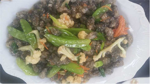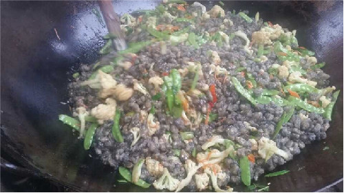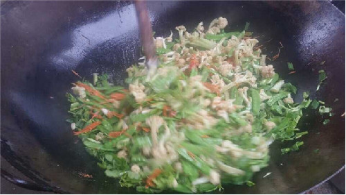 烹制蚵柳,先要挑選好個肥形大的鮮蚵,用心幾遍洗凈,再用篩細的地瓜粉薄薄拌勻,務(wù)求每只蚵仔獨立成團,再兜在漏勺里到滾開的水里焯一下即起來,再攤放有竹篩簸里晾干瀝水一個晚上。第二天中午烹制,先把油燒熱,倒入生姜末過油,再依次倒入花菜、荷蘭豆、紅蘿卜絲、芫荽等“菜腳”與鹽、雞粉、料酒、蠔油、胡椒粉、醋等佐料一并翻炒,菜蔬生汁,試嘗咸淡,再倒入已備好的蚵仔團翻炒,只需幾下,便已熟透,即可裝盤。