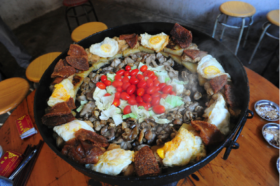 平壩凹鍋更具特色,食材十分豐富,為了拍攝平壩凹鍋小吃,我們一行來(lái)到當(dāng)?shù)厝俗诎l(fā)英家開(kāi)的勤發(fā)飯店,并被安排在二樓的里間。屋內(nèi)正中支著一口平底銅鍋,下面是燒著炭火的爐子?;鸷芡?,不一會(huì)平底鍋里的油便嗞嗞作響,主人把煎得黃黃的臭豆腐、豌豆粉等放到鍋里,鍋的中間加上一些蔬菜、小個(gè)西紅柿,色彩非常漂亮,周?chē)挤胖煌胪胗脟娤愕睦苯访姘栌袧裾核透烧核?/p>
