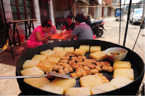 臭豆腐是平壩街的特產(chǎn),一直享譽(yù)滇東南。特別是在文山更是家喻戶(hù)曉。它火柴盒般大小,表皮長(zhǎng)滿(mǎn)一層白白的絨毛。若是蒸吃,先揀幾塊鋪在碗底,再撒撮鹽巴,放點(diǎn)食油,加些姜絲,放進(jìn)蒸鍋蒸熟。吃前用筷子攪和拌勻,看上去雪白,細(xì)嫩,宛若剛出籠的銀糕玉乳,散發(fā)出誘人的馨香。若用油煎,先將菜油舀進(jìn)鍋里,待鍋熱時(shí),立即放進(jìn)臭豆腐。隨著“嗤”的一聲,香味立時(shí)撲鼻而來(lái),再用小火耐心地將兩面煎黃,薄薄的黃皮內(nèi)含著一包乳漿??戳司妥屓舜瓜延?。