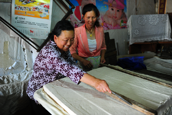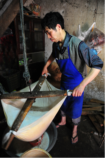 當(dāng)天上午,在拍攝好平壩古鎮(zhèn)之后,我們一行首先來(lái)到位于老街的馬曉忠家,他家的房子雖然街面不寬,但是進(jìn)深有30多米,全都堆放著加工用的工具,記者發(fā)現(xiàn),慕名而來(lái)品嘗小吃的人不少,還有些則是打包帶走,主人正在忙著煎豌豆粉和臭豆腐,他家平均每天要各加工60斤左右的豌豆和50斤左右黃豆,到了冬臘月間,就要做得更多了。沒(méi)有請(qǐng)小工,全靠夫妻兩二及小女下班后來(lái)幫幫忙,打打下手。馬曉忠說(shuō),制作過(guò)程非常辛苦,天不亮就開(kāi)始,再加上做臭豆腐,基本一天中很少有閑著的。