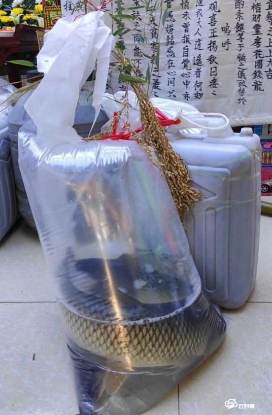 這幅圖片拍攝于都勻殯儀館,是在一位水族干部的葬禮上,三都水族自治縣九阡鎮(zhèn)的內(nèi)侄們從家鄉(xiāng)趕來憑吊姑父時,送來了三條大活魚、一頭小豬、一壺米酒等物。水族有忌葷不忌魚的習俗,內(nèi)侄送魚表示與表兄弟姊妹一道忌葷,共同戴孝,共同守制;送來的小豬為堂祭犧牲,祭奠亡人。