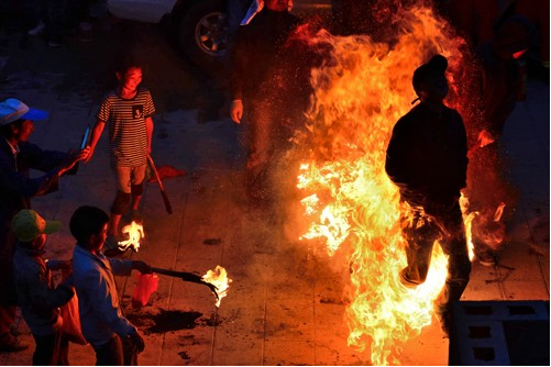 不到黃昏,鞭炮聲就響起來了。新生兒的父親點(diǎn)燃火把后,孩子們迫不及待地拿著小火把和松明粉,跑來跑去燒新生兒的的各種親戚,大人們樂呵呵地接受孩子們噴灑過來的火焰,并一致說著很吉祥的祈愿祝福語?!皬拇嘶逇獠辉趪D!”、“一年更比一年好呀!”、“紅紅火火又一年”。男女老少在火把樹下吃喝玩樂,其樂融融。糖、炒蠶豆、梨、蘋果等被大家傳來傳去,新生父親挨個(gè)向親友敬酒。親友鄰居喝著喜酒,一致祝福新生兒安康成長,將來富貴吉祥。