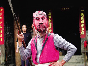 陽戲是一種原生態(tài)戲劇,其中道具的使用必不可少。主要包括服裝、面具、法器、樂器。面具在陽戲表演中占有突出的地位,是神靈的憑依和具象化。其面具有關圣帝、皇生、小生、老生、老丞相、元帥、老臣等共16面。在陽戲表演中,旦角(貴妃)是沒有面具的,搭帕子在頭上,身穿旦角服裝。面具為白楊木質(zhì)材料,精雕細琢,上面覆以濃重的彩繪。面具造型別致古樸,以頭冠和面相的特征區(qū)分角色,在藝術風格上頗具地方特色。