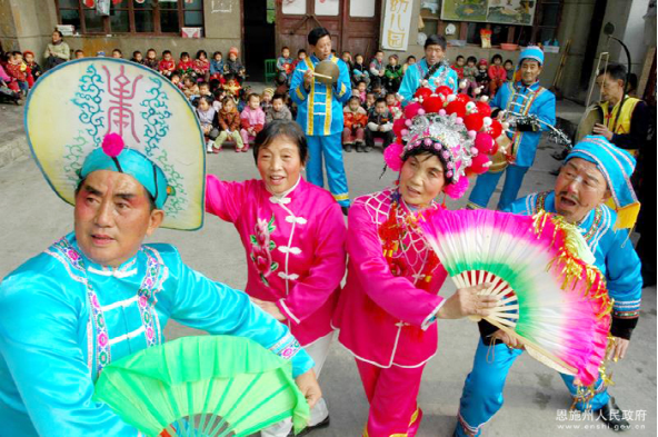 利川燈歌,又名燈調(diào),始于清代初期,已有300多年的歷史,是人們逢年過(guò)節(jié)之時(shí)以彩龍船為道具,畫(huà)地為臺(tái)、亦唱亦演的民間藝術(shù)形式。2011年5月,利川燈歌被國(guó)務(wù)院公布為第三批國(guó)家級(jí)非物質(zhì)文化遺產(chǎn)名錄。