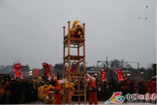 高臺是用5至7張八仙桌一層層疊壘,最上面的桌子四腿朝天,總高度近8米。四人登臺表演。兩個(gè)人扮獅子,把獅頭獅皮披在身上,只露雙腳;另外兩人分別裝扮成孫悟空和笑臉和尚揮舞手帕,大蒲扇逗引獅子逐層攀上高臺,為了穩(wěn)固,安全起見,每張桌子的四角都用草紙疊浸水后墊著防滑,做到萬無一失。