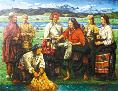 “以前畫畫時,對自己的最高要求就是畫得要逼真,把油畫畫得像一幅放大了的照片,而現(xiàn)在關(guān)注的是如何畫出能體現(xiàn)當(dāng)代的畫面。西藏的美是無窮無盡的,我就想用繪畫的方式窮盡一生去追求,展現(xiàn)大美西藏?!比缃竦乃髀幔チ顺醭雒]時一味追求畫面質(zhì)感的匠氣,多了些許內(nèi)心對西藏這片熱土深層次的思考。他筆下的西藏是一片充滿生機的土地,濃墨重彩之間,既有對傳統(tǒng)和過往年華的回望和懷念,又在仿若不經(jīng)意間透過一個眼神、一抹色彩、一個小物件盡情詮釋活力和希望。