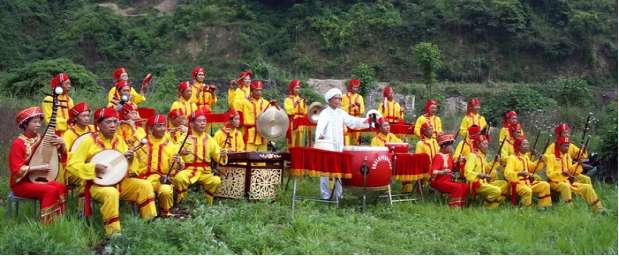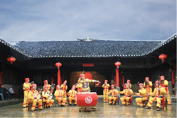 民間藝人在現(xiàn)場表演絲弦鑼鼓
