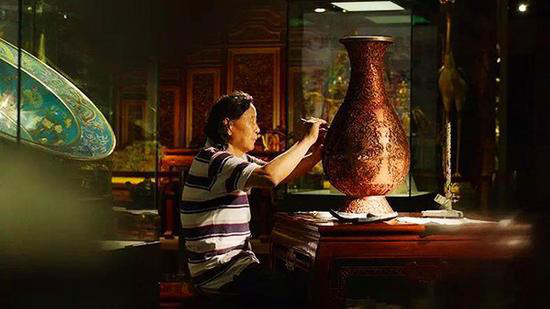 “寶瓶如花放光彩,全憑巧手把花栽,不得白芨花不開(kāi),不經(jīng)八卦蝶難來(lái),不受水浸石磨苦,哪能留得春常在?!薄@首民謠惟妙惟肖地唱出了景泰藍(lán)制作過(guò)程的繁復(fù)與艱深。