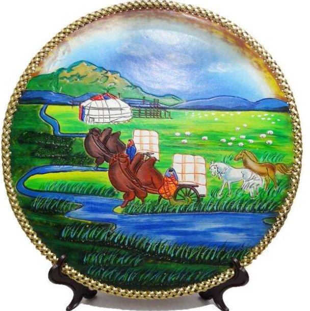 蒙古皮畫,精選草原天然優(yōu)質(zhì)牛皮經(jīng)過特殊描繪、著色、層染、拋掐光、定形,半浮雕凹凸壓制等一系列工藝、幾十道工序,純手工制做完成。充分利用和展示了天然皮革所具有的皮質(zhì)皮色,具有線條流暢,構(gòu)描圖別致,立體感強(qiáng),色彩柔和等特點(diǎn),給人以全新的藝術(shù)享受。