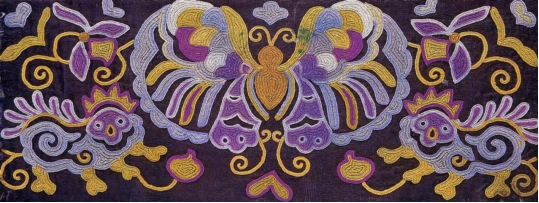 臺江苗繡的圖畫紋飾豐富,有造型獨(dú)特的飛禽走獸、花鳥魚蟲,還將人與大自然的其他動植物在繡片上融為一體,體現(xiàn)了苗族人民對自然萬物的崇拜,同時(shí)也折射出苗族屢經(jīng)遷徙的歷史變遷。