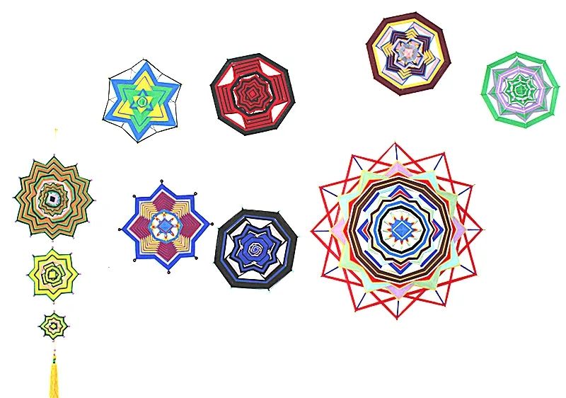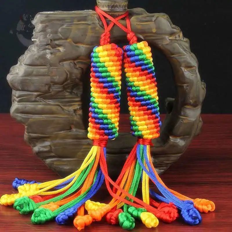 科爾沁繩編設(shè)計精巧,尤其擅長表現(xiàn)游牧民族生活之美, 具有地域民族風(fēng)情之美,繩結(jié)造型多為上下一致、左右對稱、正反相同、首尾銜接。一根彩繩通過綰、結(jié)、穿、纏、繞、編、抽等多種工藝技巧,按照章法循環(huán)有致、連綿不斷編制而成。近代由于蒙漢文化的融合,繩編技法也開始相通了。