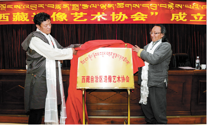 2017年12月3日,西藏造像藝術協(xié)會在拉薩成立。 圖為該協(xié)會會長朵普·次嘎(左)與西藏民族藝術研究所副所長阿旺丹增共同為協(xié)會揭牌。