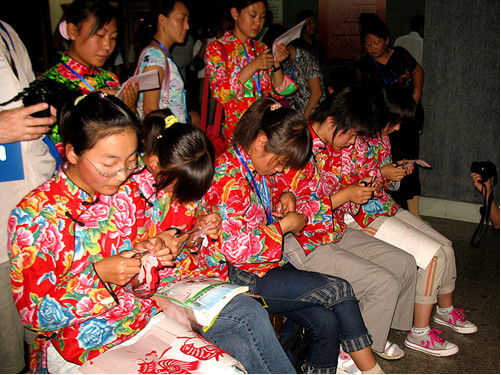 內(nèi)蒙古和林格爾剪紙是中國北方剪紙最具代表性的剪紙文化遺存之一,是由世代生活在和林格爾地區(qū)的農(nóng)牧民勞動婦女為主體創(chuàng)造的,經(jīng)過代代傳承發(fā)展,成為承載本土民族文化基因的重要的非物質(zhì)文化。二十世紀七、八十年代以來,隨著經(jīng)濟社會向工業(yè)文明的急速轉(zhuǎn)型,人們的生產(chǎn)、生活方式和觀念發(fā)生了重大轉(zhuǎn)變,和林格爾剪紙面臨消亡的境地。老一輩和林格爾民間剪紙傳承人大都生活窘困,有許多已相繼辭世,她們長達七、八十年藝術實踐所形成的這一古老文化傳承也因此面臨人亡藝絕,而年輕一代剪紙隊伍又尚未形成,和林格爾剪紙的發(fā)展出現(xiàn)了青黃不接的瀕危狀況。帶著全社會的關注,1998年7月10日,在時任和林格爾縣委宣傳部長姚子明同志的支持下,和林格爾縣成立了內(nèi)蒙古自治區(qū)第一個旗縣剪紙學術組織——和林格爾剪紙學會。和林格爾剪紙學會的成立,是和林格爾剪紙文化事業(yè)發(fā)展的一個里程碑和轉(zhuǎn)折點。多年來,和林格爾剪紙學會克服困難,深入搶救、發(fā)掘、整理和保護了縣境一大批珍貴的原生態(tài)剪紙遺存和老一輩剪紙傳承人。從1994年到2010年,共已累計搶救、發(fā)現(xiàn)珍貴的原生態(tài)和林格爾剪紙七萬余幅,發(fā)現(xiàn)和保護老一輩剪紙傳承人2600余人,其中有140余名70歲以上的老一輩剪紙傳承人,學會做為重點搶救、考察對象而開展了全年跟蹤式搶救、保護和記錄。和林格爾剪紙學會對已發(fā)現(xiàn)的老中年剪紙傳承人給予物質(zhì)獎勵和精神關懷,激活了人們對于剪紙傳承的積極性和創(chuàng)作熱情,以農(nóng)村婦女為主體的傳承群體又重新拿起剪刀,開始了剪紙的傳承和傳播。多年來,和林格爾剪紙學會在段建珺會長的帶領下,以“讓老大娘們重新拿起剪刀,讓年輕一代傳承剪紙”為宗旨,積極開展各類剪紙活動,努力探索剪紙在新形勢下的教育傳承和發(fā)展工作,涌現(xiàn)出以張花女、段建珺等為代表人物的一大批才華橫溢,在國內(nèi)外有影響的杰出剪紙傳承人和經(jīng)典剪紙作品。百歲剪紙大師張花女出生于清代光緒年末年,剪紙學會發(fā)現(xiàn)她時,老人已是96歲高齡。在學會的幫助下,她重新拿起剪刀,傳承和創(chuàng)作了大量剪紙,堪稱珍品。張花女的作品,將剪和紙的特性發(fā)揮到了幾盡完美的境界,圓潤而不浮華,凝重而不果板,簡約而不單簿,通俗而不失典雅。她剪的《魚龍變化》、《蒙人進城》、《碾場》等作品,反映了遠古時期仰韶文化與紅山文化、中原文明與草原文明在該區(qū)域碰撞、交流、融合的歷史遺存,具有很高的藝術考古價值。在長達一個多世紀生命的最后幾年中,張花女用剪刀和紅紙創(chuàng)造了一個當代中國剪紙的神話。