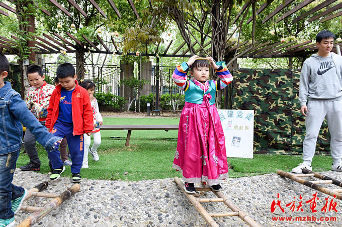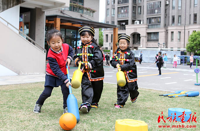 畬族的“摘柿子”、維吾爾族的“賽馬”、黎族的“跳竹竿”、蒙古族的“射箭”……天恒名都幼兒園的操場(chǎng)上,孩子們正積極參加各種民族游戲活動(dòng),沉浸在無(wú)憂無(wú)慮的快樂(lè)中。4月13日,是上海市莘莊工業(yè)園區(qū)天恒名都幼兒園的“民族接力棒小社團(tuán)”活動(dòng)日,孩子們非常期盼這每周一次的活動(dòng)日。