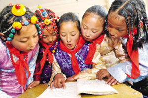 西藏昌都地區(qū)實驗小學(xué)的學(xué)生們在一起念課文