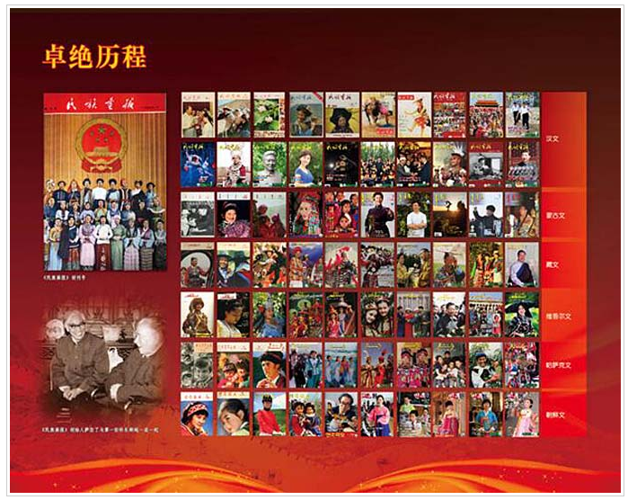 《民族畫(huà)報(bào)》創(chuàng)刊于1955年2月,周恩來(lái)總理題寫(xiě)刊名?!睹褡瀹?huà)報(bào)》用漢、蒙古、藏、維吾爾、哈薩克、朝鮮等6種文字出版,發(fā)行全國(guó)各省市區(qū)及世界50多個(gè)國(guó)家和地區(qū),一直與《人民畫(huà)報(bào)》《解放軍畫(huà)報(bào)》并成為“中國(guó)三大畫(huà)報(bào)”。2013年獲“中國(guó)百?gòu)?qiáng)期刊”稱號(hào)