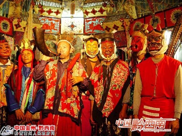 生活在黔西南州貞豐、晴隆、普安、望漠、冊亨、安龍、興義等8縣市的20萬苗族同胞的先民,在遠古時代“信鬼不信神”,認為人的靈魂不滅,祖先死后靈魂仍在,可以保佑子孫后代。因此,苗族先民往往祈求祖先,助其實現(xiàn)心愿,一但酬愿便要祭祀祖先,俗稱“還儺愿”。還愿時舉行的儀式就是儺儀。還儺愿主要由苗巫師主持,跳儺時配以唱、念及動作,儀式非常莊嚴肅穆。明末清初民間藝人開始將“還儺愿”的部分內(nèi)容整理、加工、完善后搬上舞臺,便成了儺戲。因此說,儺戲是從莊嚴的祭祖儀式脫胎而成的一種獨具特色的地方曲目。儺戲沒有管弦樂,但有節(jié)奏明快的鑼鼓伴奏,曲調(diào)流暢悅耳,劇情風趣詼諧,更具有濃郁神秘的苗族文化色彩,深受苗族同胞的喜愛。