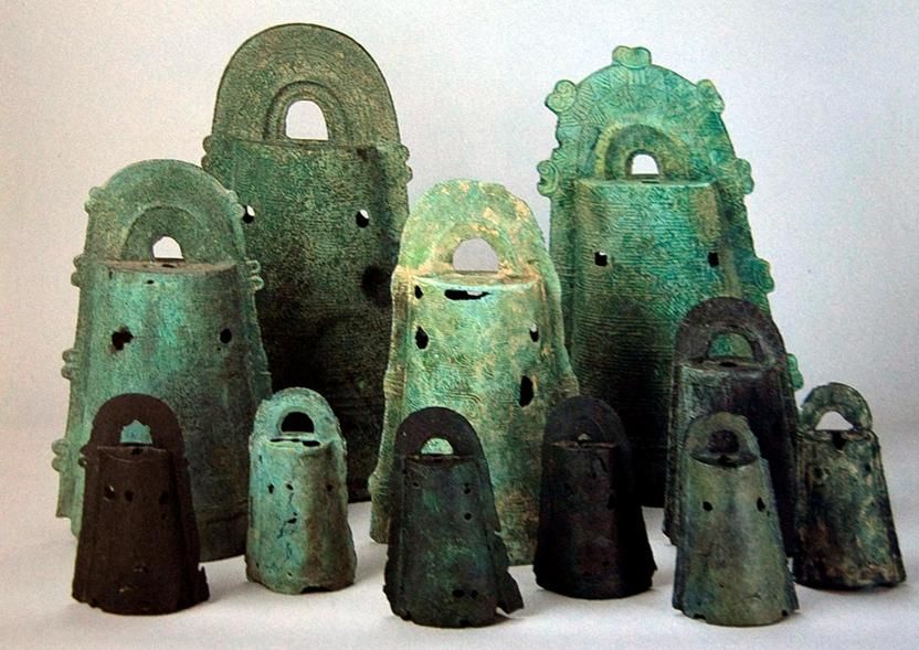 彌生時(shí)代也是機(jī)織布技術(shù)傳播,金屬器的使用和制造開始的時(shí)代。銅鐸,是日本本土生產(chǎn)的一種器型,為祈愿豐收時(shí)祭祀用的鳴鐘,常見于貴族墓葬中。使用的時(shí)候僅敲擊單獨(dú)一件,與中國(guó)成組配套使用的編鐘不同。
