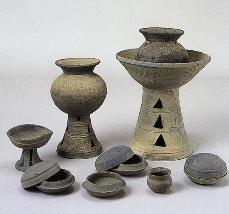 彌生時(shí)代的名稱,源自1884年東京市本鄉(xiāng)彌生町“彌生陶器”的發(fā)現(xiàn)。彌生陶器與繩紋陶器截然不同,為素面,灰色。日本人認(rèn)為彌生陶器是“渡來人”制造的。“渡來人”是中國(guó)大陸通過朝鮮半島而來,他們帶來了陶器的制作技術(shù)。彌生陶器為深釜器,以甕形器、缽形器、高腳杯(豆形器)為主(圖五)。