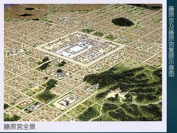 飛鳥-奈良時(shí)代對(duì)作為中央集權(quán)國(guó)家的象征的都城建設(shè),極其重視。藤原京是持統(tǒng)、元明、元正三代天皇延用了16年的都城遺址,這個(gè)遺址經(jīng)過幾十年的考古發(fā)掘,已經(jīng)探明了藤原京和藤原宮的范圍及布局(圖二十)。京城東西及南北各長(zhǎng)5.3km,平面近正方形,宮城在其中央,這點(diǎn)與唐長(zhǎng)安城不同。有學(xué)者認(rèn)為,藤原京是以《周禮》規(guī)定的理想化都城建制為依據(jù)所筑成的。