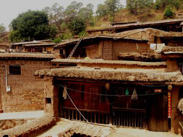 彝族是農(nóng)牧兼營的民族,村寨的分布與坐落有其獨(dú)特的傳承。彝族的村寨多坐落在海拔2000~3000米的山區(qū)、半山區(qū),相沿聚族而居。為適應(yīng)西南地區(qū)亞熱帶氣候和山地特點(diǎn),彝民們便就地取材,以一種最容易、最節(jié)省錢財(cái)人力的建房方式,創(chuàng)造出中國建筑的獨(dú)特樣式——土掌房。土掌房多建于山地斜坡上,以石為墻基,用土坯砌墻或用土筑墻,墻上架梁,梁上鋪木板、木條或竹子,上面再鋪一層土,經(jīng)灑水抿捶,形成平臺房頂,不漏雨水。有的大梁架在木柱上,擔(dān)上墊木,鋪茅草或稻草,草上覆蓋稀泥,再放細(xì)土捶實(shí)而成。