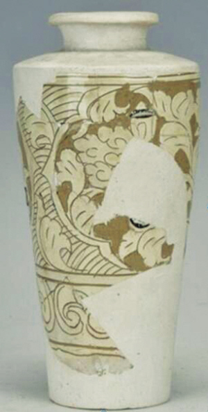 褐釉剔刻菊花紋經(jīng)瓶,高32厘米、口徑8.8厘米、底徑8.9厘米,三級(jí)文物。腹部四分葵口紋內(nèi)剔刻開光折枝菊花紋,花瓣細(xì)密舒展,四周花葉搖曳有動(dòng)感,開光外刻劃花葉紋和弧線紋。其下為兩組雙線弦紋,施褐釉。殘存肩及腹部一半,其余為后修復(fù)。