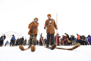 在今年的慶?;顒?dòng)上,當(dāng)?shù)睾每偷母髯迦罕娚碇鴤鹘y(tǒng)服飾,載歌載舞。手拿單杖、腳踏毛皮滑雪板的小伙兒,與腳踩現(xiàn)代雪板、手持雙杖的小伙兒并排站立,分外搶眼。